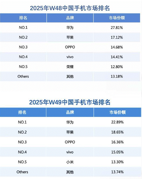近期有数码科技媒体公布2025年第48周国内手机销量前二十榜单中,仅开售数日的华为Mate 80标准版便跻身前三,打破了今年9月以来,苹果iPhone 17系列长期包揽单周销量前三的局面。整体份额上华为手机国内市场份额连续2周超越苹果,重夺国内市场份额第一。