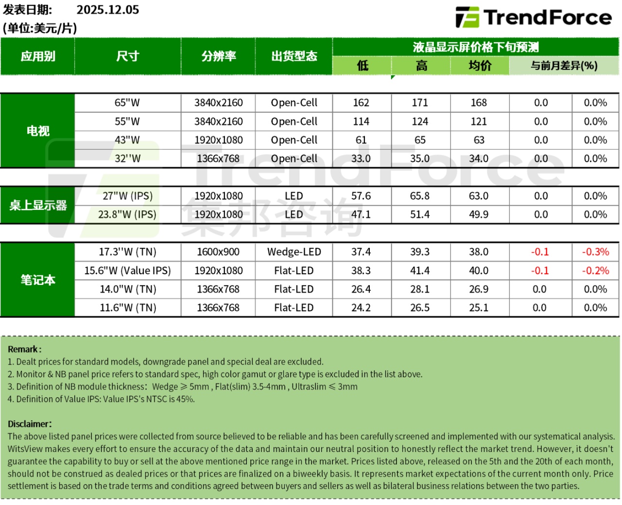 集邦咨询:12月电视与显示器面板价格预估持稳 笔电面板部分尺寸价格预期下调