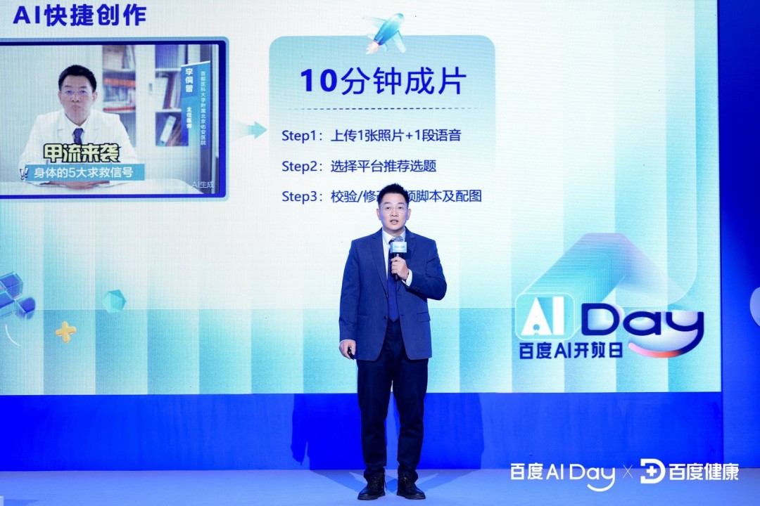 李侗曾作为医生代表,现场分享了用百度AI创作平台做科普的深度体验:“以往做健康科普,医生常被时间、流程束缚,就像‘追着热点跑’—— 比如流感高发季,等 3 天做完视频,热点早已过时。但百度健康的 AI 创作工具让科普变简单了:门诊间隙传张照片、口述核心要点,AI 会精准匹配热点选题,自动生成脚本和图示,10 分钟就能产出合规又易懂的视频,真正实现‘热点到哪,专业内容就跟到哪’。”
