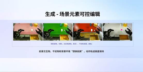 基于多模态信息的深度融合,模型可生成长时动态交互场景视频,在场景内实现各元素精准可控;并具备跨本体一键生成、多本体泛化、预测万千演化路径等特性,为具身智能提供高保真、可泛化的虚拟训练环境。