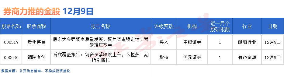 据证券之星数据库不完全统计,12月9日券商共给予2家A股上市公司“买入”评级。从行业分布看,券商12月9日关注的个股聚焦于酿酒、有色金属等行业。