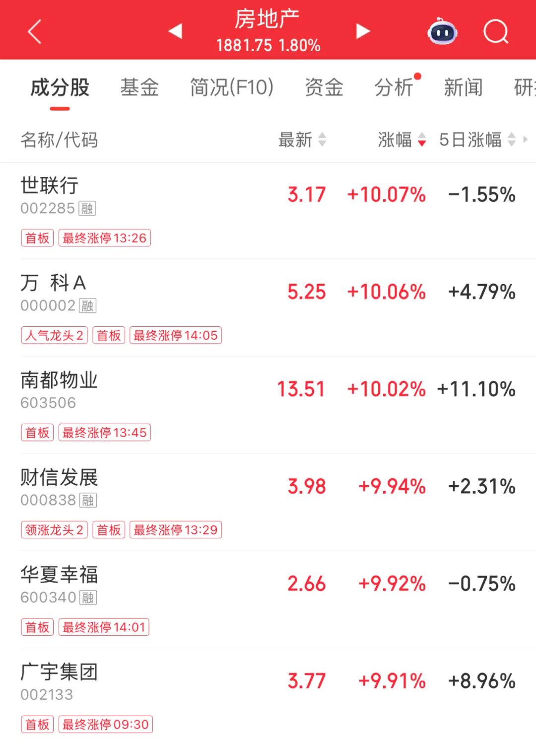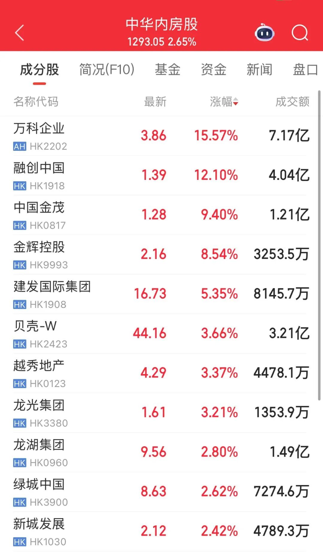 在万科带动下,港股融信中国、融创中国涨超12%,世茂集团涨11%,中国金茂涨逾9%,碧桂园涨超5%。A股财信发展(000838)、华夏幸福(600340)涨停,金地集团(600383)、保利发展(600048)、绿地控股(600606)等跟涨。