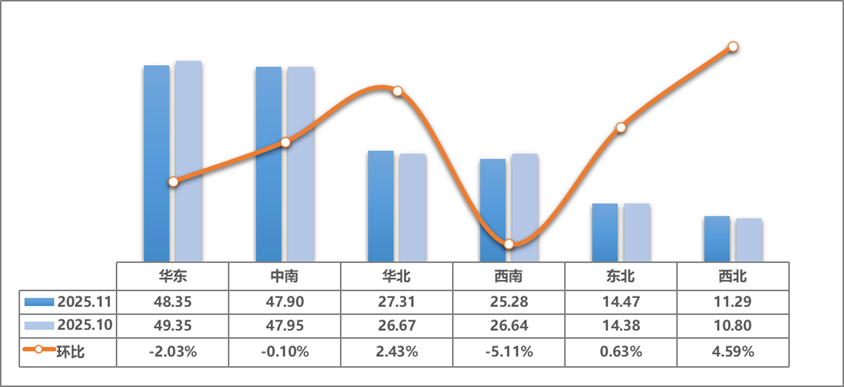 2025年11月,全国二手车市场的整体交易量延续了小幅下滑的态势。从六大区市场表现来看,华东、中南及西南地区的交易量环比均出现了不同程度的缩减。不过,华北、东北和西北地区的交易量相较于上月,则均实现了不同程度的增长。