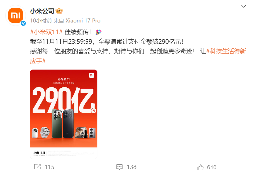 2025年11月12日凌晨,小米正式公布了"双十一"购物节战报,显示截至11月11日23:59:59,全渠道累计支付金额突破290亿元大关。小米创办人、董事长兼CEO雷军迅速通过社交媒体发文,向广大消费者表达诚挚感谢。