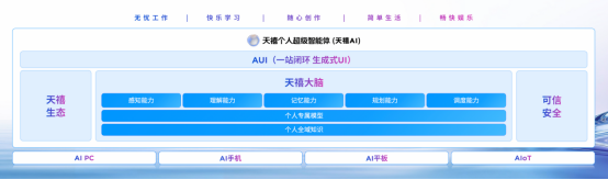 天禧AI由AUI、天禧大脑、天禧生态和可信安全平台构成,拥有感知、理解、记忆、规划、调度五大能力。天禧AI 3.5实现了“三大飞跃”:首先是个性化飞跃,依托“全时空主动记忆”技术,结合全域知识库,生成因人而异的个性化答案;第二是行动力飞跃,通过超级智能体工作群,实现多智能体协同,如AI播客、ChatExcel、超级互联3.0都是其代表应用;第三是交互体验飞跃,天禧AI 3.5具备多端协同感知,统一的AUI,让用户获得始终如一的智能体验。