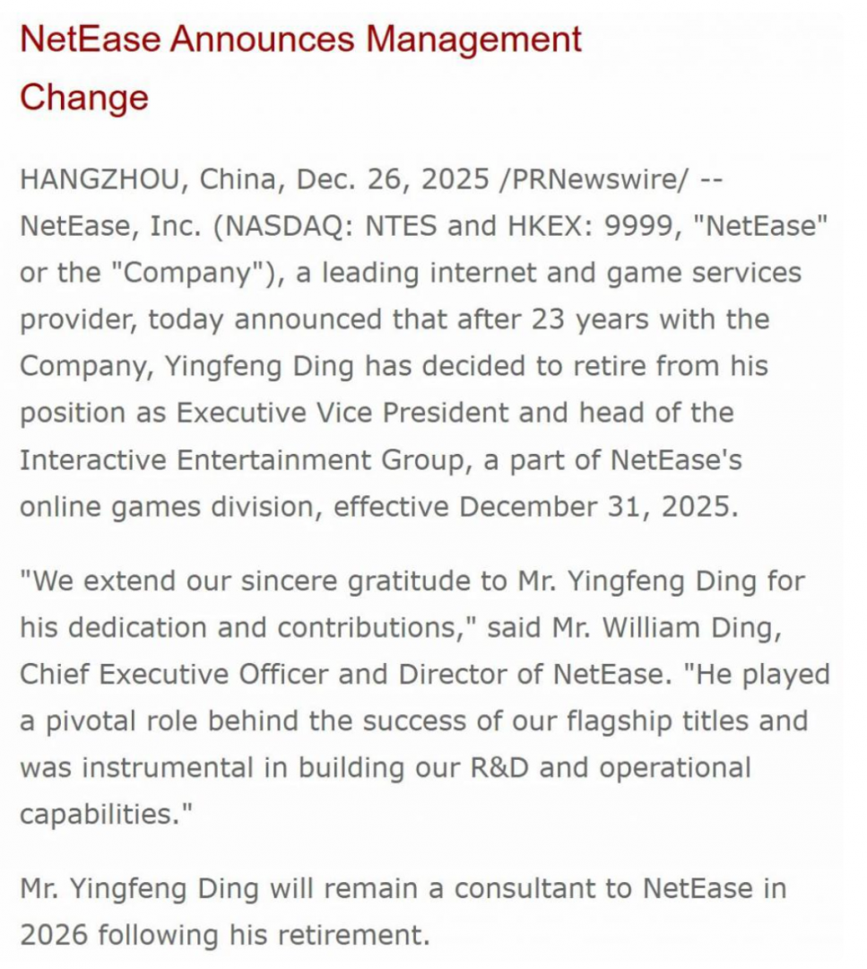 12月27日消息,网易发布公告称,网易集团执行副总裁、网易互动娱乐事业部负责人丁迎峰将结束其在网易23年的任职,于2025 年12月31日正式退休。退休后,他将继续担任公司顾问职务。