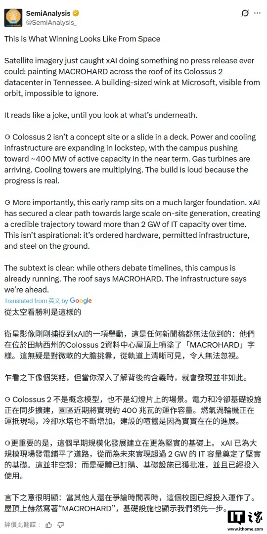 同时,马斯克所回应的帖文还引用了半导体研究机构 SemiAnalysis 的数据,指出 xAI 在其位于田纳西州孟菲斯的 Colossus 数据中心屋顶喷上了“巨硬”(IT之家注:Macrohard)字样,剑指微软(Microsoft)。