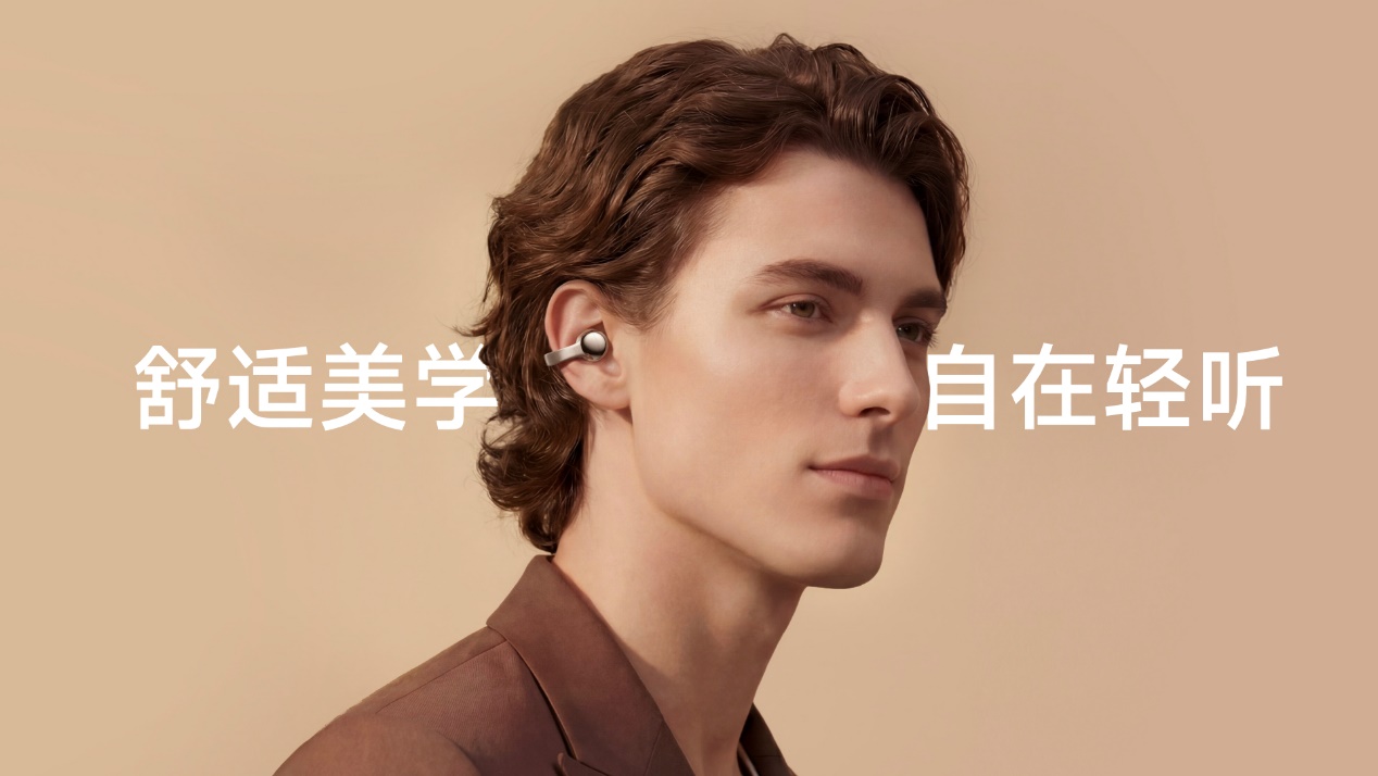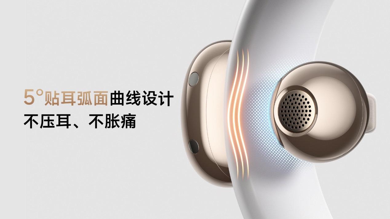 其前侧悦听球经过多轮位置微调,贴合在最有利于传声、也最不易偏移的位置;后侧能源仓采用 5° 贴耳弧面曲线设计,顺应耳后自然轮廓,一贴即稳。整体结构将传统“夹力”转化为均匀、柔和的包裹力,如同气流贴合耳廓,实现真正的“零压力承托”。