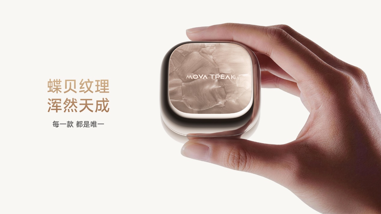 Clip Pro在设计语言上突破了传统耳机的功能化表达,将耳机塑造成一件可佩戴的日常配饰。耳机有三种配色,分别为星芒金,羽墨灰,云曦白。耳机盒的柔光外观设计,灵感源自珍珠母贝的温润质感与砂光的细腻光泽,会随光线变化而逐渐显现的高级质感。为呈现这一效果,MOVA TPEAK采用了蝶贝纹理,使漆面在保持通透与耐刮性能的同时,于不同角度下呈现近似珐琅般的宝石光泽,为耳夹带来更具轻奢感的视觉体验。