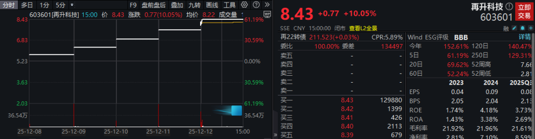 12日,本周“连板牛股”再升科技(603601)今日高开后震荡上扬,用时不到10分钟就封住涨停,拿下“五连板”的同时股价创近三年新高。