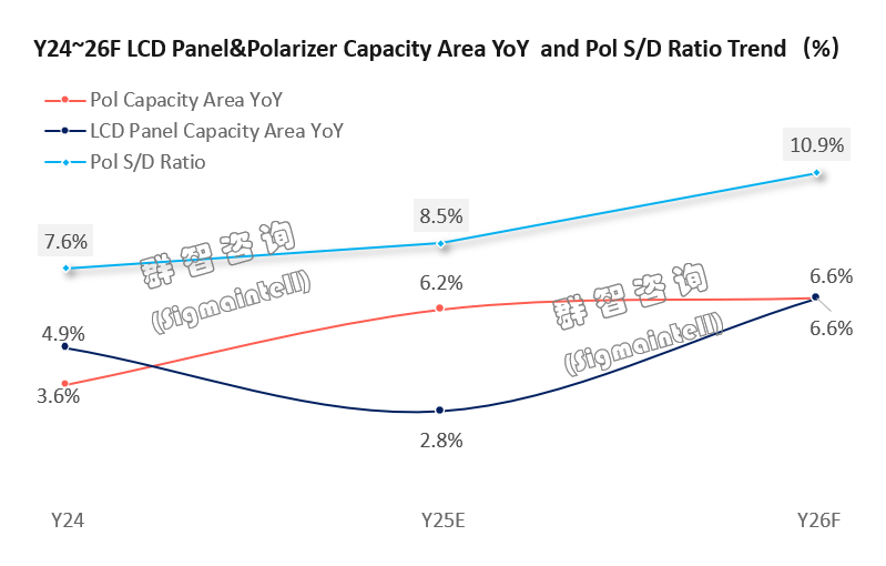 2026年全球偏光片产能依然处于重整中,产能增速减缓。而需求端,在LCD TV面板大尺寸化带动下偏光片需求面积持续增长,群智咨询(Sigmaintell)预计2026年全球LCD面板用偏光片的供需比为10.9%,供需处于动态平衡,LCD面板用偏光片的价格有望趋于相对稳定。