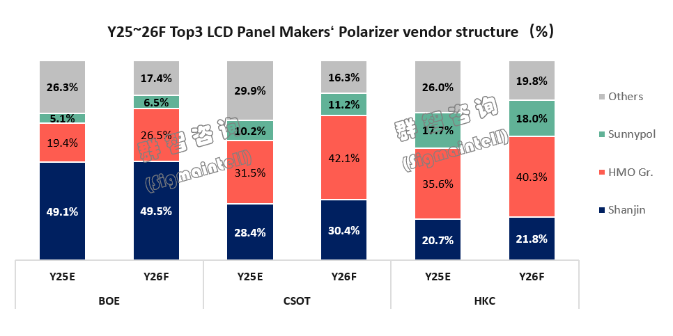 京东方(BOE):与杉金光电战略合作。2025年LCD面板用偏光片需求中杉金光电占比接近50%,预计2026年将维持约五成的份额。在偏光片供应方面,京东方得到杉金光电的最优保障,以及产品研发方面的高度协同,共同开发了STW高端面板用偏光片,对京东方的高端品形成了加持和保障。随着恒美与SDI业务交割完成,预计2026年恒美集团在BOE内部的偏光片占比也将进一步提升到超20%的水平,成为京东方LCD面板用偏光片的第二大供应商。头部两家偏光片厂商供应份额超七成,偏光片供应走向更集中。