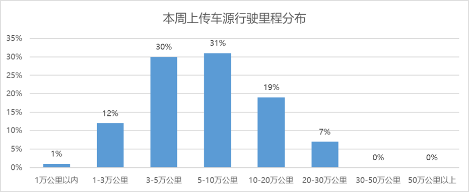从上传车源行驶里程数据来看,1-3万公里“准新车”数据、5-10万公里的“性价比”车源数据均与上周持平,3-5万公里的“较新车”数据较上周增加了1%,10万公里以上“老旧”车源数据较上周则增加了1%,本周上报数据质量较上周略好。
