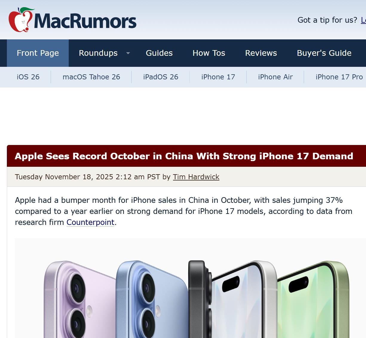 (驱动中国/邓支航)11月下旬,有关iPhone 17系列在中国市场的一路狂飙,助推iPh