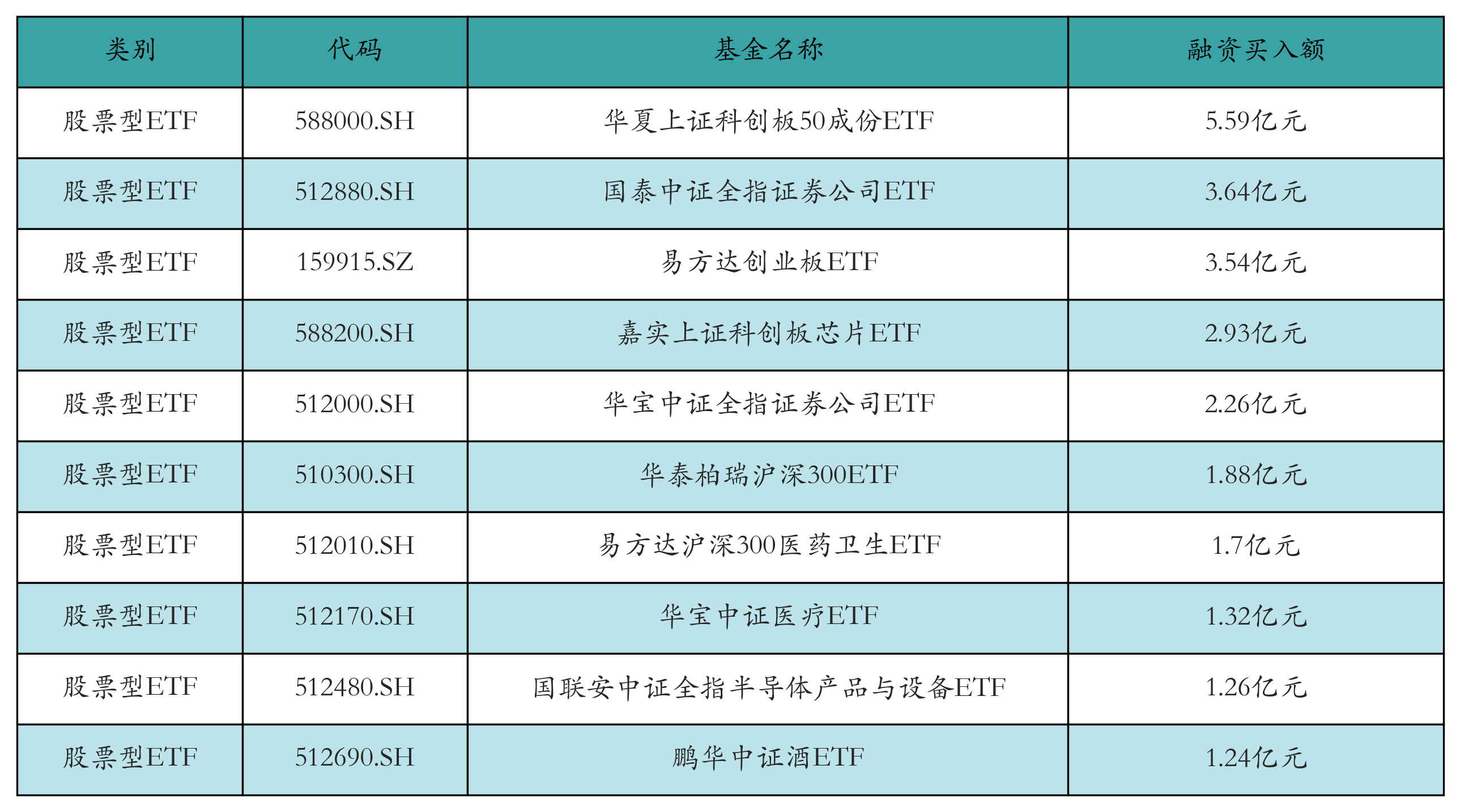 昨日股票型ETF融资买入额最高的3只ETF及其买入金额分别为:华夏上证科创板50成份ETF(5.59亿元)、国泰中证全指证券公司ETF(3.64亿元)、易方达创业板ETF(3.54亿元)。融资买入额前10详情见下表: