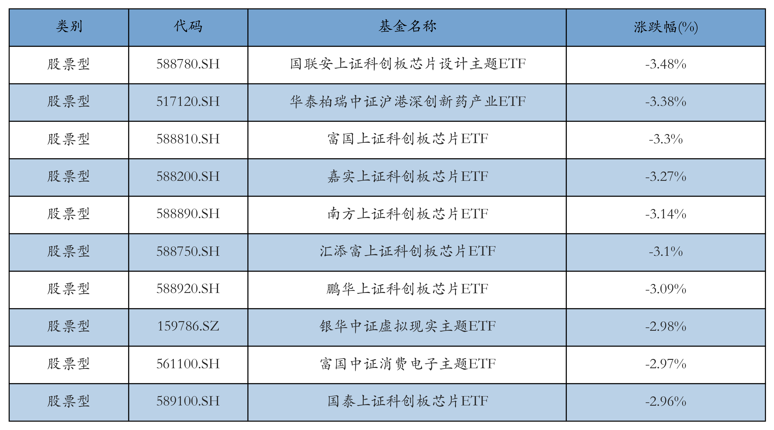 昨日股票型ETF跌幅最大的3只ETF及其收益率分别为:国联安上证科创板芯片设计主题ETF(-3.48%)、华泰柏瑞中证沪港深创新药产业ETF(-3.38%)、富国上证科创板芯片ETF(-3.3%)。跌幅前10详情见下表: