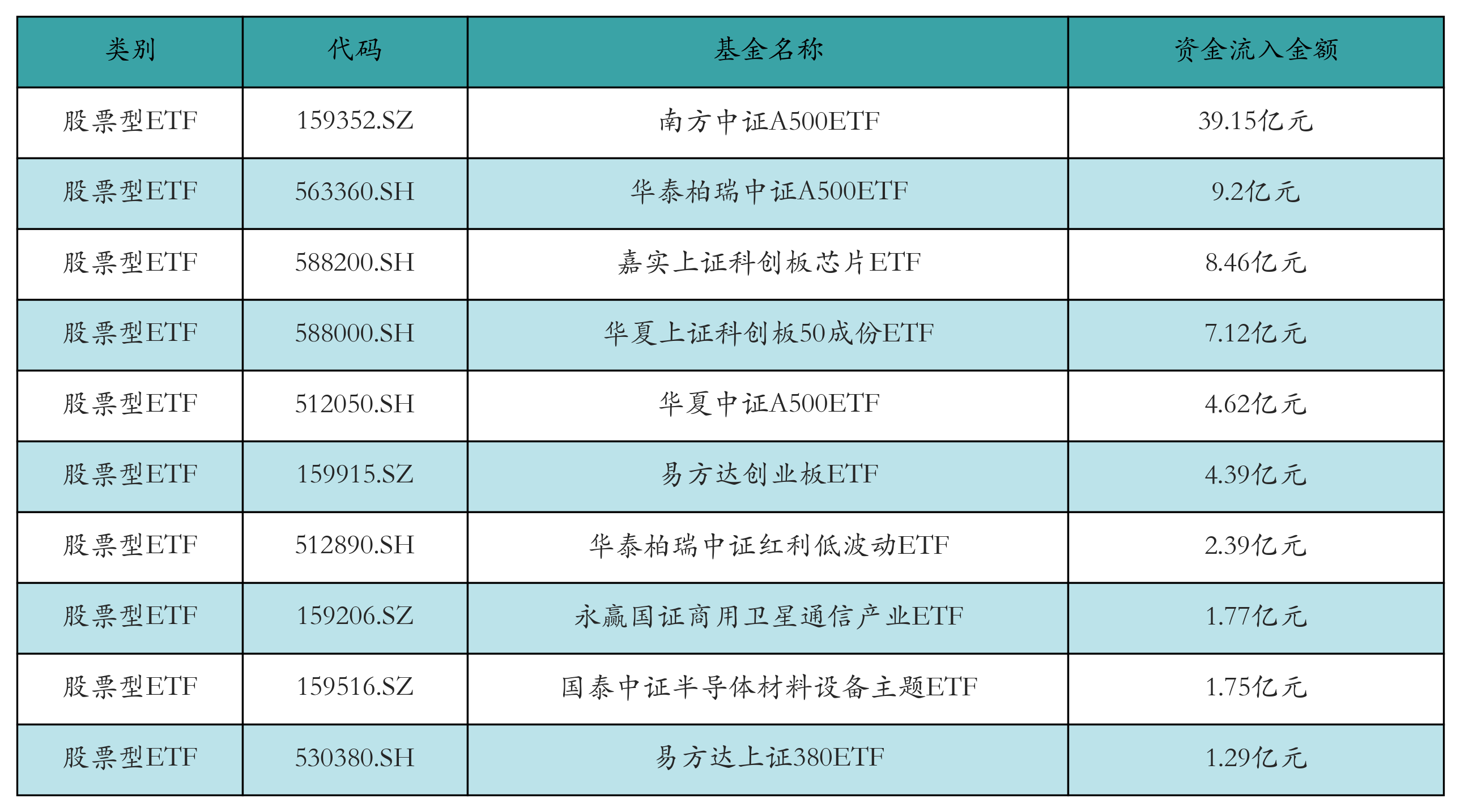 昨日股票型ETF资金流入最多的3只ETF及其流入金额分别为:南方中证A500ETF(流入39.15亿元)、华泰柏瑞中证A500ETF(流入9.2亿元)、嘉实上证科创板芯片ETF(流入8.46亿元)。资金流入前10详情见下表: