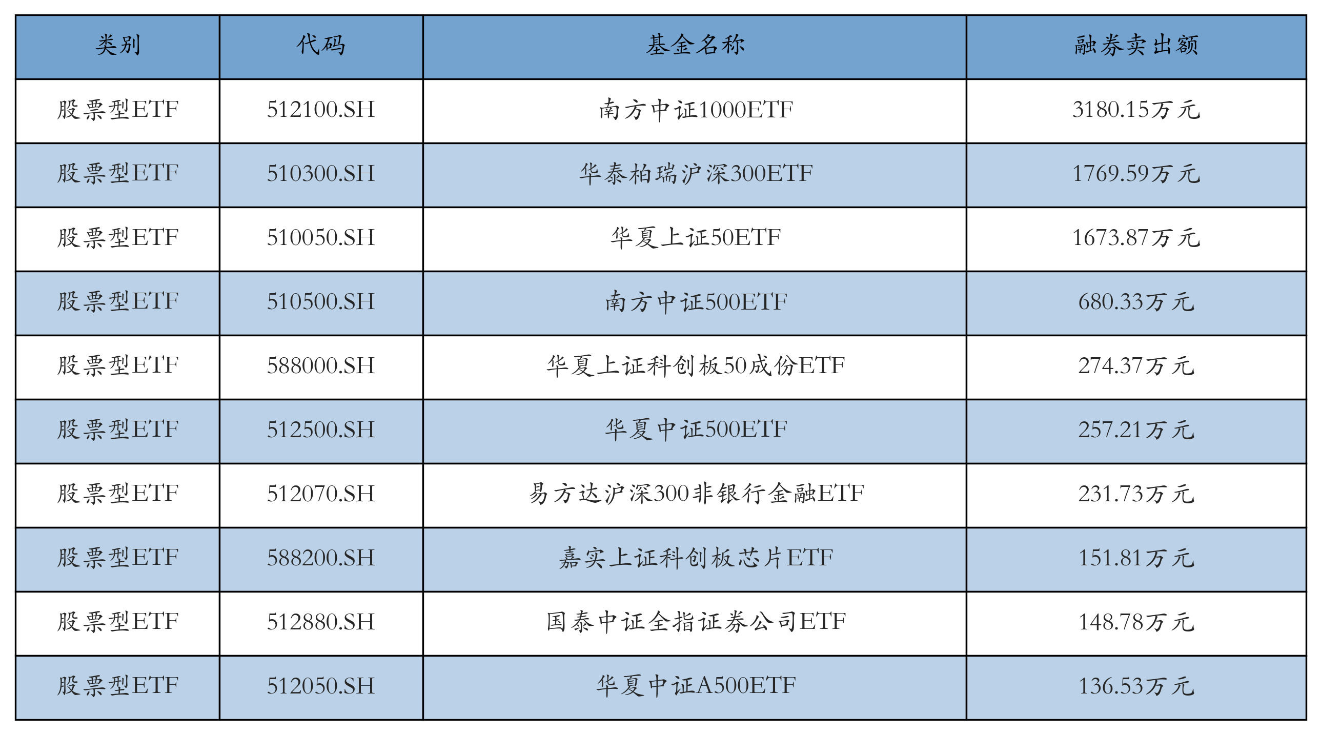 昨日股票型ETF融资卖出额最高的3只ETF及其卖出金额分别为:南方中证1000ETF(3180.15万元)、华泰柏瑞沪深300ETF(1769.59万元)、华夏上证50ETF(1673.87万元)。融券卖出额前10详情见下表: