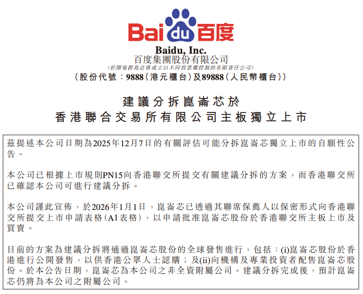 百度在港交所发布公告,宣布1月1日昆仑芯已透过其联席保荐人以保密形式向香港联交所提交上市申请。公告表明,分拆完成后,预计昆仑芯仍将为百度的附属公司,但具体发售规模与结构尚未最终确定。
