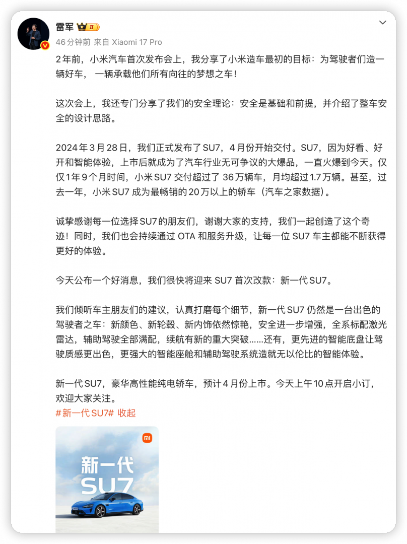 小米官宣新一代SU7预计今年4月上市