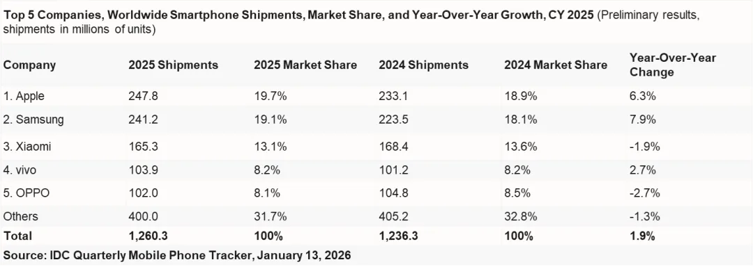 2025年中国手机市场激活量:vivo、小米、苹果前三