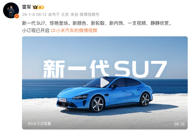 1月8日消息,在昨日晚间的直播中,小米创办人,董事长兼CEO雷军透露,新一代SU7预售价22.99万元起,比上一代SU7起售价贵1万多。大家可以通过小米汽车APP支付1000元意向金,上市后随时可退。对于锁定未交付的SU7用户,如果想改款,还可以继续保留原有订单的购置税权益,锁单优先排产,提车还将赠送价值699元智能双表盘,预计2026年4月起交付。
