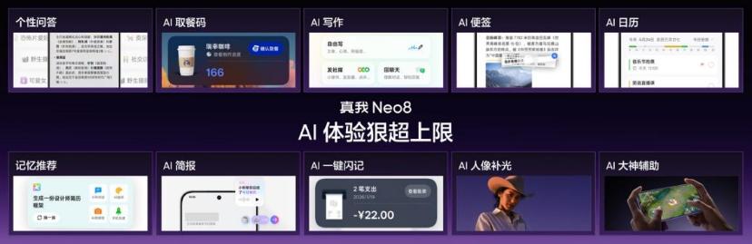 旗舰配置方面,超声波3D指纹湿手秒解、超线性立体双扬声器配合X轴线性马达打造沉浸体验、红外遥控与360°NFC带来便利操作。系统方面,真我Neo8搭载全新realme UI 7.0系统,带来AI一键闪记、AI实景对话、灵动窗口等创新功能,并配备AI大神辅助3.0、游戏4D振感等全方位电竞体验。