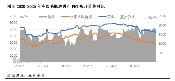 历史上,价差出现过短期波动,例如在2022年瓶片价格急速上涨期,两者价差曾一度收窄至1100元/吨左右。这通常是由于瓶片价格受需求拉动快速上行,而毛瓶价格因回收体系传导相对滞后所致。随后市场会通过毛瓶价格的补涨或瓶片价格的回调,使价差逐步回归至合理区间。
