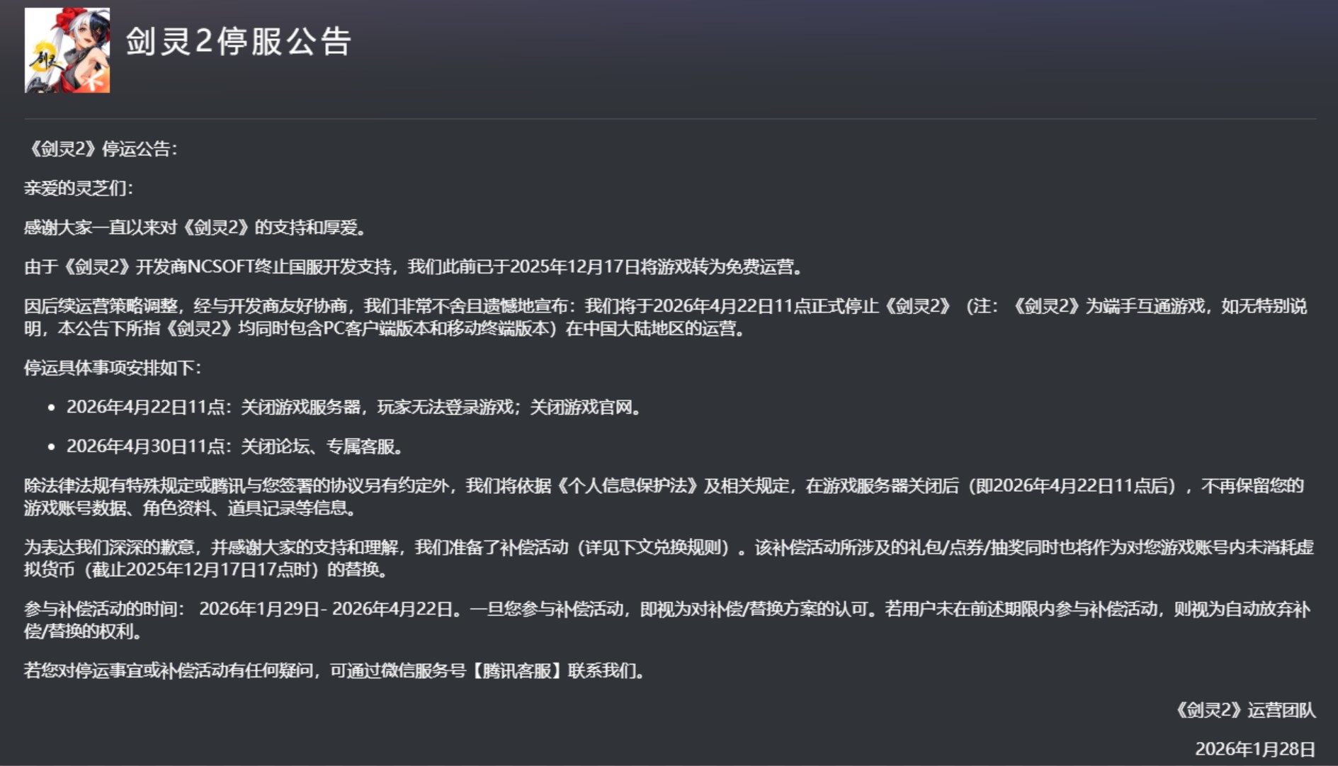 腾讯游戏今天午后发布《剑灵2》国服停运公告,宣布将于2026年4月22日11时起终止该游戏在中国大陆地区的全部运营服务。这款由韩国NCSOFT开发、小明太极与腾讯联合运营的端手互通MMORPG,自2025年4月3日公测至今不足一年,便因开发商全球战略调整而提前谢幕。