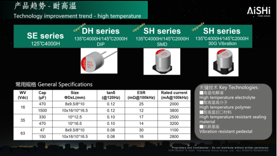 综上所述,汽车电子水泵正朝着高压高效、智能精准、集成模块及材料工艺创新的方向快速演进,这对其中关键元器件——铝电解电容的性能提出了耐高温、耐高纹波、高抗振的全面挑战。艾华集团基于对行业需求的深刻理解,推出的车规级固液混合铝电解电容系列产品,凭借其融合液态与固态电容优异的特性,恰好为电子水泵的可靠、高效与小型化设计提供了有力的支撑。