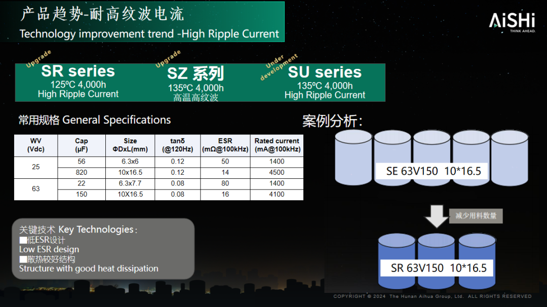 车规级固液混合电容主要有三个发展方向,X轴方向的耐高温,Y轴方向的小型化大容量,以及斜线方向的耐高纹波;