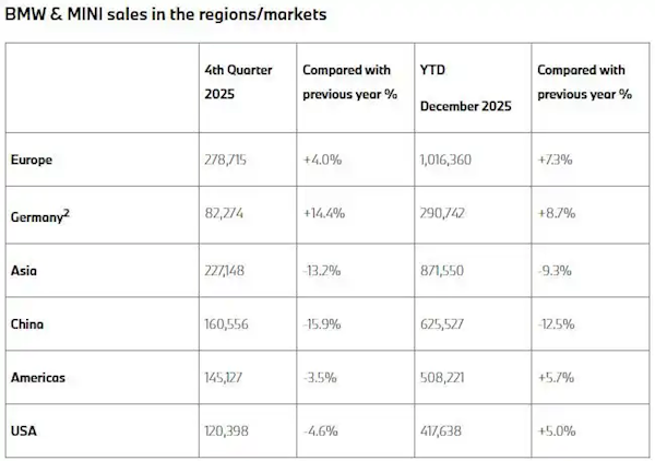 宝马集团近日公布了集团销量数据,显示其在2025年全年销量达到2,463,715辆,同比微增0.5%。尽管全球整体表现平稳,但各区域市场表现差异显著,其中欧洲市场全年累计销量达1,016,360辆,同比增长7.3%;美国市场全年累计销量为417,638辆,同比增长5.0%。