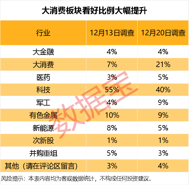 对于下周A股市场的潜力板块和方向选择,大消费板块看好比例大幅提升,环比提升14个百分点,最新为21%。