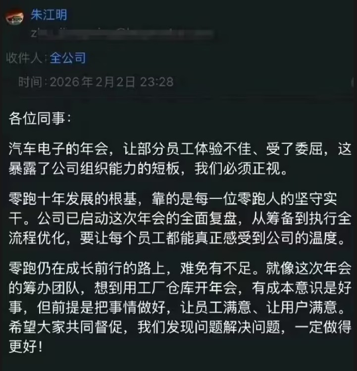 针对近日网络热议的“零跑汽车年会拉胯”事件,公司创始人、董事长朱江明于2月2日深夜发布全员内部信,坦诚回应员工关切。他在信中承认,部分员工在年会中“体验不佳、受了委屈”,暴露出公司在大型活动组织能力上的短板,并宣布已启动从筹备到执行的全流程复盘与优化。
