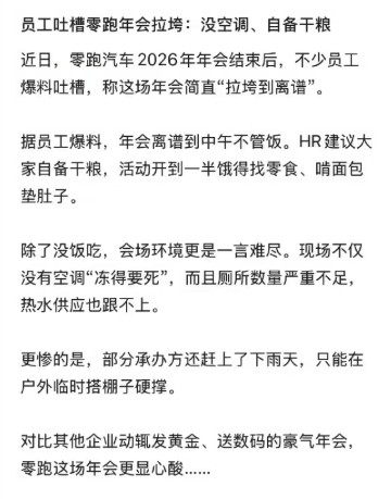 此次争议源于1月30日零跑电子产品线年会结束后,有员工在社交平台爆料称现场“中午不管饭,HR建议自备干粮”“无空调、厕所不足、热水短缺”,甚至因突遇雨天被迫在户外搭棚举行,被形容为“拉胯到离谱”。相关话题迅速发酵,引发公众对这家2025年新势力销冠企业内部管理的质疑。朱江明在信中并未回避问题核心,他肯定筹办团队“用工厂仓库办年会”的成本意识,但强调“前提是把事情做好,让员工满意”。