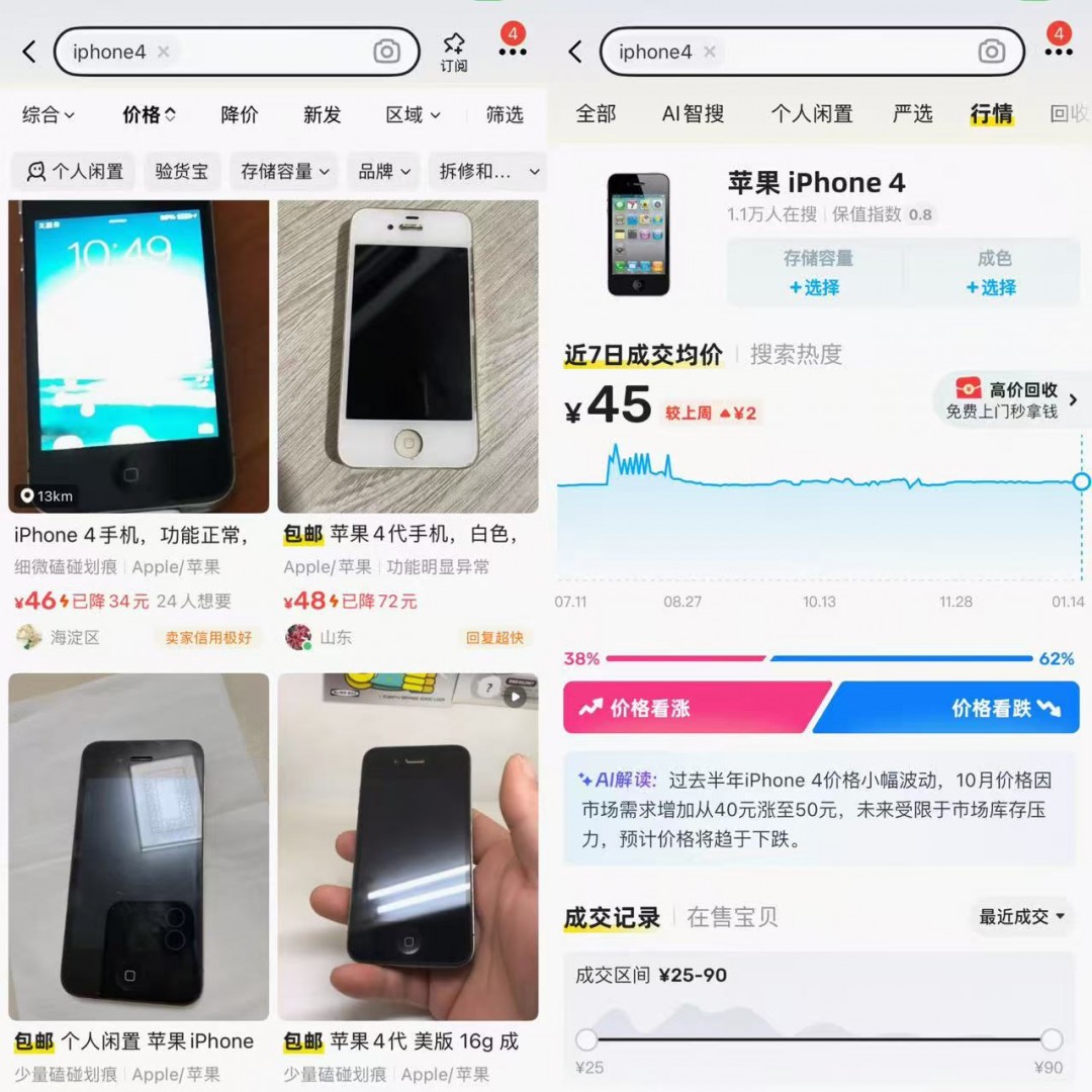 查看闲鱼二手交易平台,大部分iPhone 4的报价在100元以内,也有一些在200到300元之间,全新未拆的iPhone 4报价可达近千元。平台行情数据显示,iPhone 4近7日交易价格在45元左右。