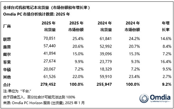 1月13日消息,今日,市场调研机构Omdia发布2025年全球PC出货量数据。