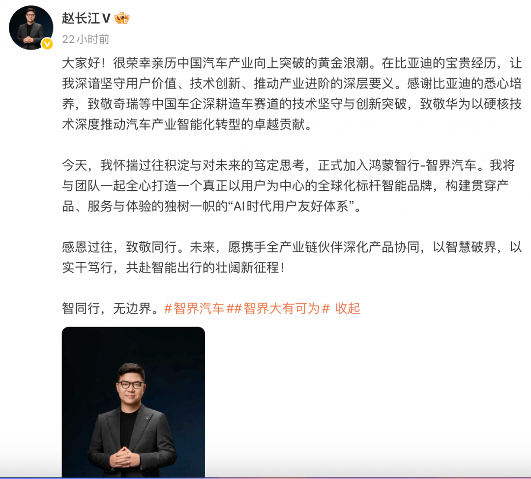 原比亚迪16年老将赵长江加盟智界 任执行副总裁