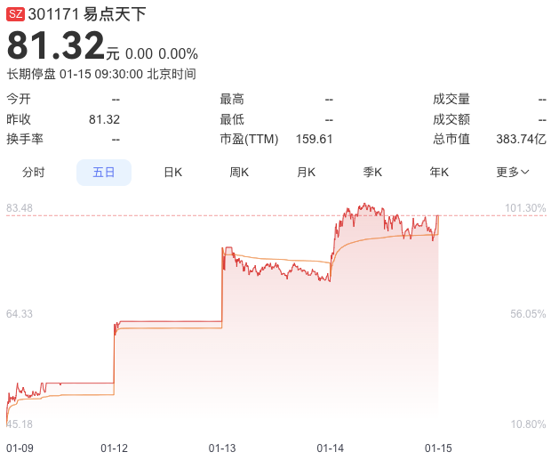 1月15日消息,易点天下网络科技股份有限公司(股票代码:301171)发布公告,因公司股票近期出现严重异常波动,为维护投资者利益,经申请,公司股票自2026年1月15日开市起停牌核查,预计停牌时间不超过3个交易日。