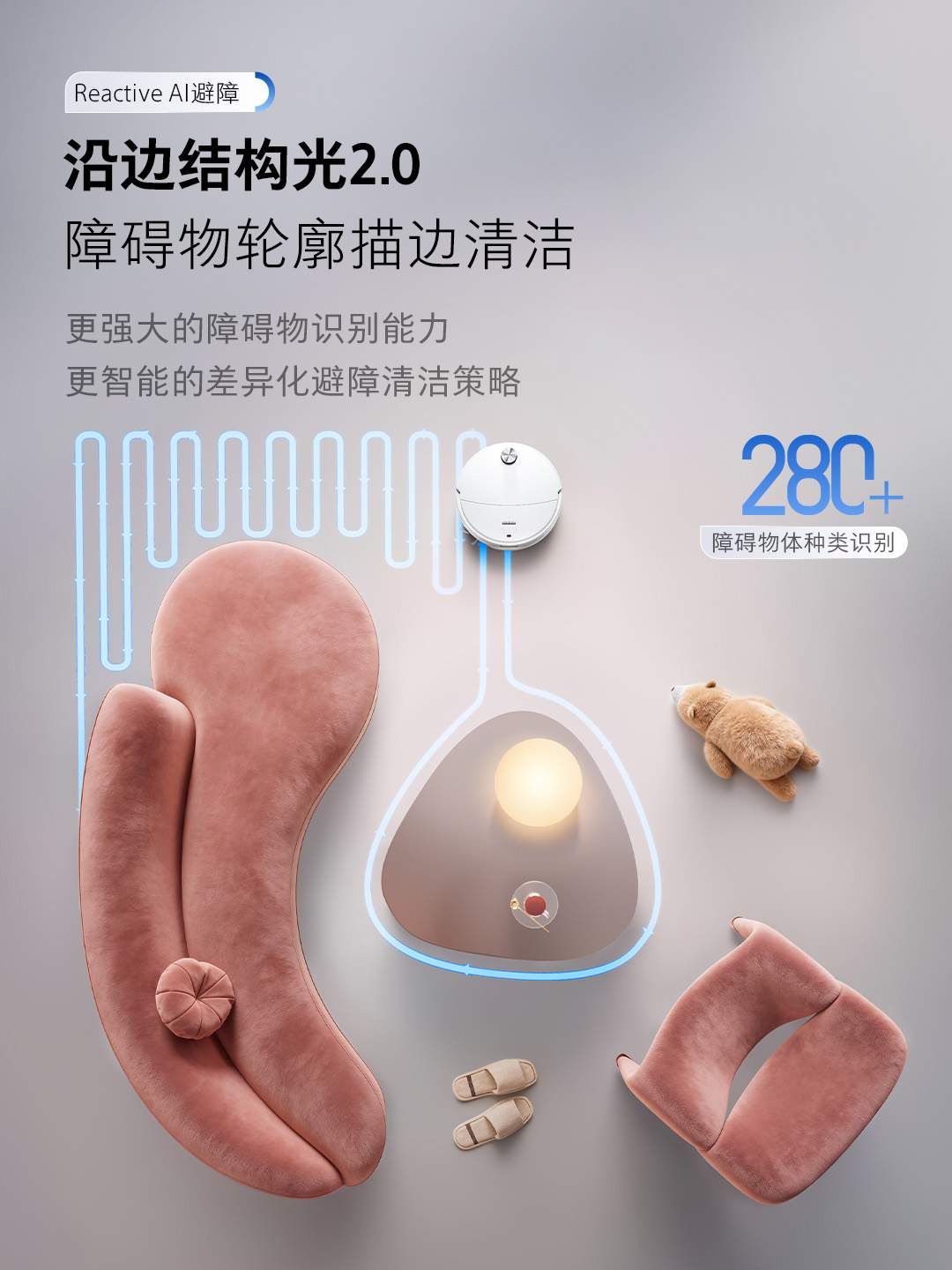 不仅如此,P20 Max采用后置升降LDS结构,最低可通过7.95cm的低矮空间;降下LDS后保留110°后窗视角,保障定位与路径规划稳定。在避障方面,P20 Max新增了沿边结构光2.0与Reactive AI系统协同方案,精准识别超过280种物体,并根据物体类型动态调整贴边距离,在降低碰撞风险的同时减少漏扫与无效移动。
