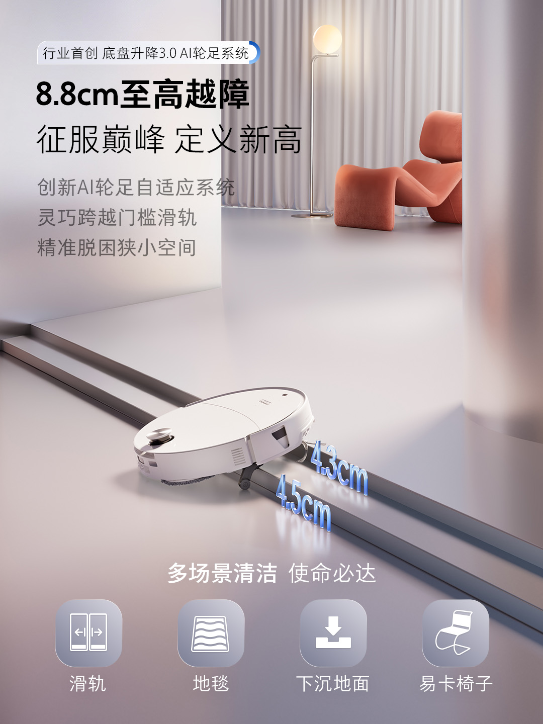 在越障过程中,摆臂轮通过改变接触结构,提升通过效率;主轮实现0–2cm无极抬升控制;万向轮同步参与姿态稳定调节,完成平顺跨越。在保证稳定性的同时提升通过率,使复杂门槛与地毯叠加结构更易通行。