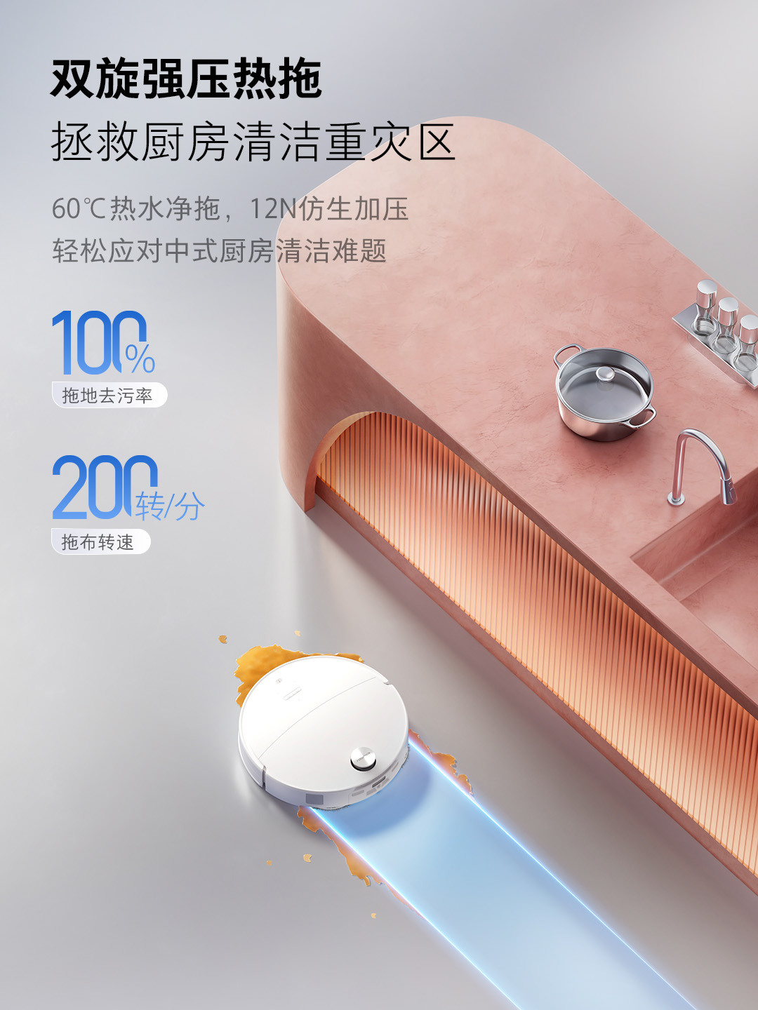 拖地方面,P20 Max支持最高12N动态下压力与60℃恒湿热擦,在重污区域自动增强清洁强度;常态8N压力兼顾地面保护。双旋拖布最高200转/分钟,结合动态机械臂贴边设计,实现更高边角覆盖率。通过吸力、结构设计与路径策略的协同,构建完整的清洁能力闭环。