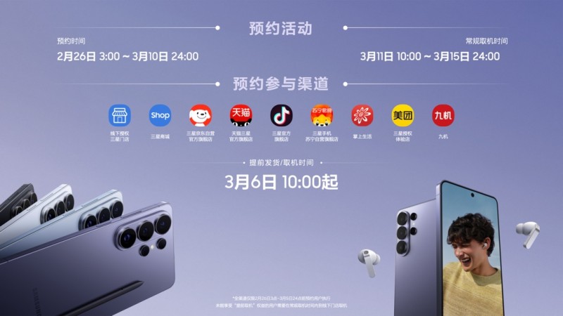 本次发布的三星Galaxy S26系列包含三款机型:三星Galaxy S26 Ultra建议零售价9999元起,三星Galaxy S26+建议零售价7999元起,三星Galaxy S26建议零售价6999元 。目前,系列新品的预约活动已在三星商城及各大线上线下官方授权渠道开启 。成功预约购机的用户,可有机会参与“加价升杯”活动:Galaxy S26 Ultra 512GB版本加价1600元可升级至1TB版本;Galaxy S26 Ultra及S26+ 256GB版本加价800元可升级至512GB 。此外,在3月5日24点前成功预约购机的用户,将享有提前发货服务 。