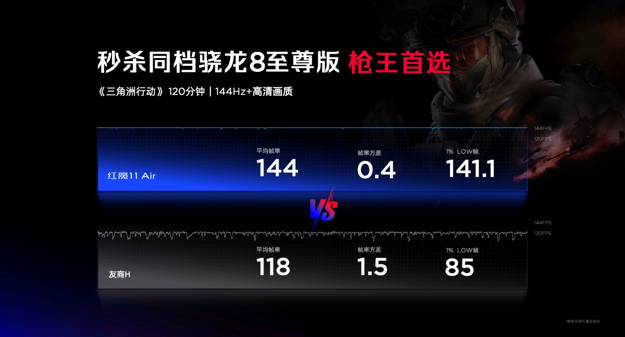 在发布会上,红魔官方也展示了红魔11 Air的游戏实测水平。在144Hz高清画质下运行120分钟《三角洲行动》,红魔11 Air平均帧率为144帧,1%LOW帧为141.1帧,对比机型平均帧率为118帧,1%LOW帧为85帧。