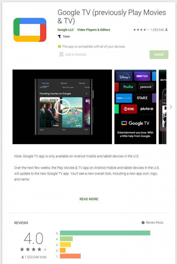 这款应用现在已在 Google Play Store 中发布 ... 有人猜测 Google 可能最终会摆脱 Google Play Store 的命名,只称其为 Google Store 或类似的名字 ... Google TV 应用程序当前仅适用于美国地区的 Android 移动手机和平板设备。