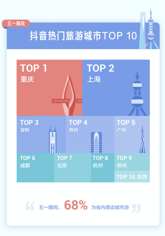 抖音发布五一数据报告,抖音旅游视频数量相比去年五一增加 5.9 倍