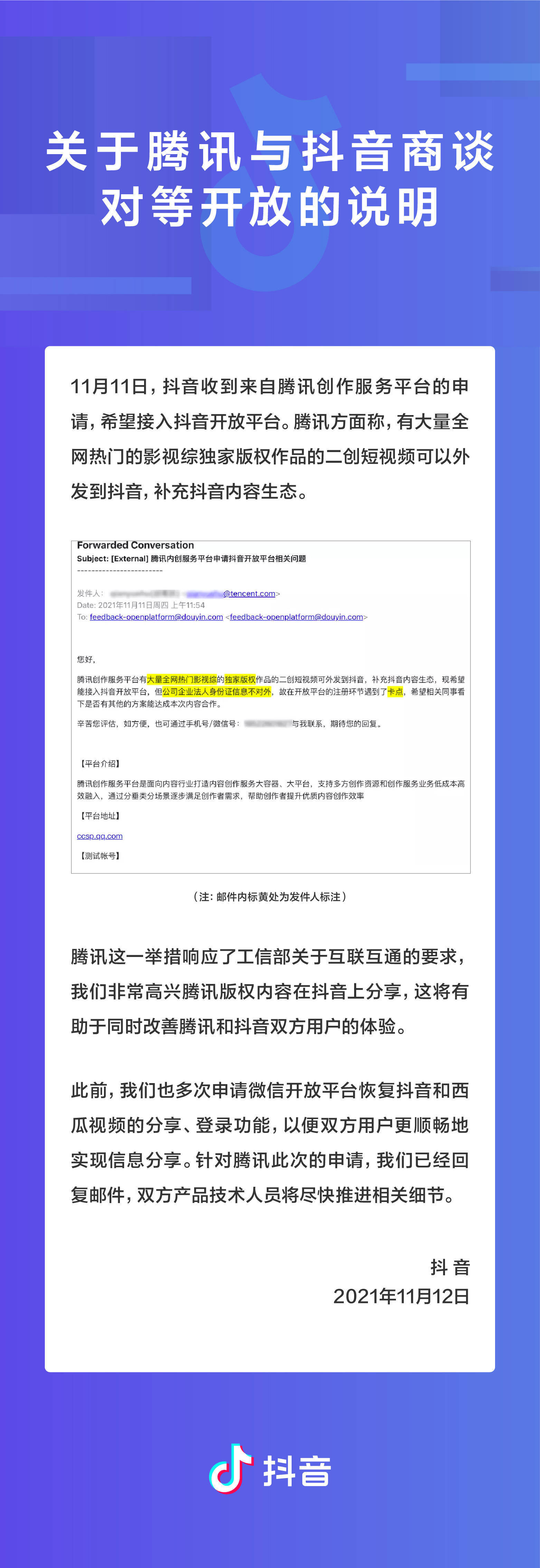【#腾讯与抖音商谈对等开放#】#腾讯抖音互联互通更进一步#12日,抖音发布关于腾讯与抖音商谈对等开放的说明,11月11日,抖音收到来自腾讯创作服务平台的申请,希望接入抖音开放平台。腾讯方面称,有大量全网热门影视独家版权作品的二创短视频可以发到抖音,补充抖音内容生态。抖音认为,这是响应了互联互通的要求,对此非常高兴,对腾讯此次申请,已经回复邮件,双方技术人员将尽快推进相关细节。(吴涛)