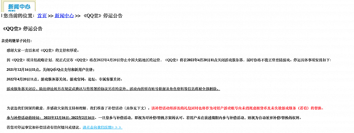 12月16日,腾讯游戏《QQ堂》发布停运公告称,因《QQ堂》项目组战略计划,现正式宣布《QQ堂》将在2022年4月20日关闭游戏服务器,停止中国大陆地区的运营,届时玩家将不能正常登陆游戏。