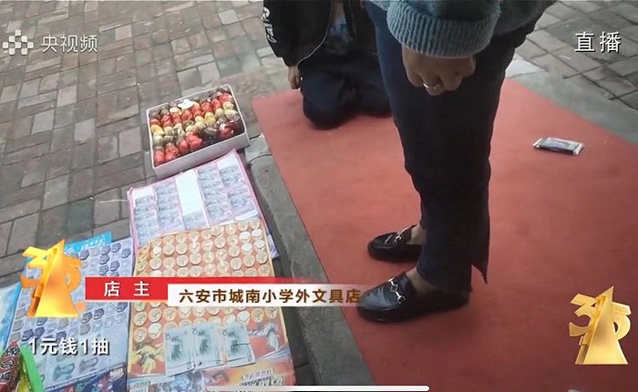 今年央视315晚会,学校旁边小店非法抽奖玩具的现象被报道关注。抽龙珠、弹力球、红外线笔、陀螺等孩子们喜爱的玩具变成了抽奖产品,流行的卡通形象、心仪的奖品和抽奖的刺激这样的诱惑让未成年的小学生难以阻挡。短短几分钟就可以坑走他们几元到几十元不等的零花钱。