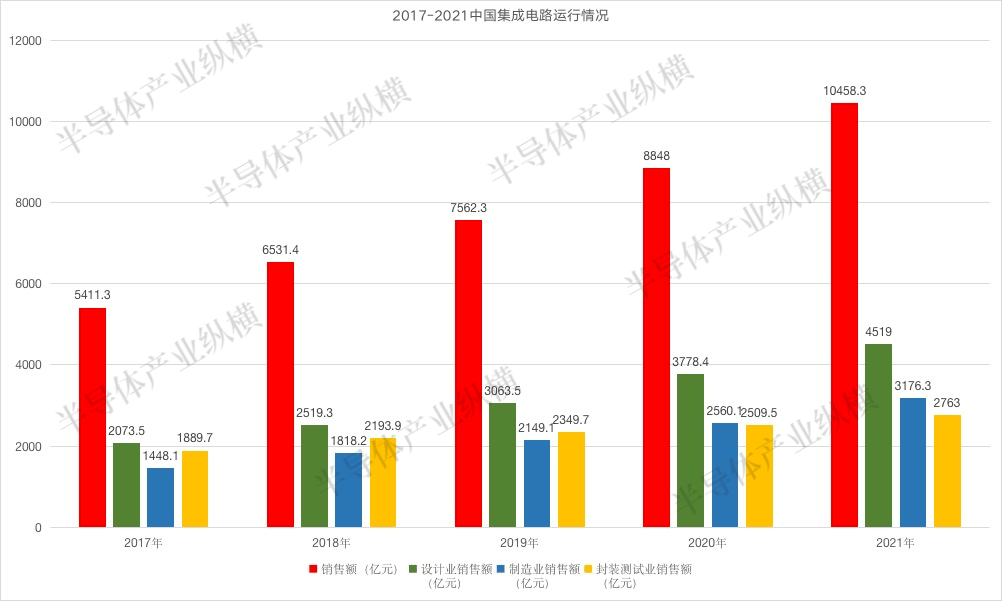 依照中国半导体行业协会发布的数据,2021年中国集成电路销售额首次突破了万亿元,达到10458.3亿元。从销售额的数据来看,中国集成电路的销售额从2017年就开始稳步增长。